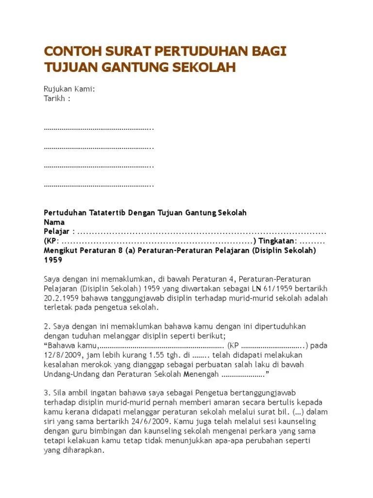 Contoh surat pertuduhan untuk tujuan gantung sekolah sebagai hukuman tatatertib later head sekolah ruj. Sekolah menengah kebangsaan alam semesta . Bil9/1975( murid boleh digantung sekolah atau dibuang sekolah). Lampiran d lampiran d contoh surat gantung sekolah untuk tujuan penyiasatan sehingga tindakan tatatertib selesai.